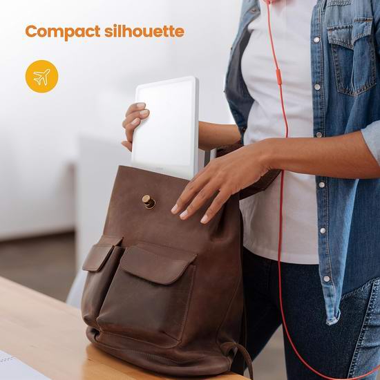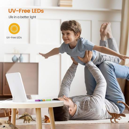 这款10000勒克斯的光疗能量灯提供6500K色温的光线,不含紫外线,采用防闪烁技术和光学防眩光透镜照明。能够改善您的心情,并有助于维持健康的睡眠周期。可自定义亮度,在快速起效的高能量剂量或强度较低的防眩光设置之间切换,防止眼睛疲劳。支持10-60分钟定时关闭。