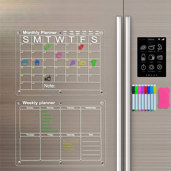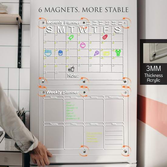 采用优质透明亚克力材料制成,配备强力磁铁,可牢固吸附在冰箱或任何金属铁质表面,配备磁性贴纸,也可将干擦板粘贴在任何墙壁或门上使用。配备8色记号笔,2块擦布和1块橡皮擦。可用于学习计划、工作清单、留言板、绘图板和便笺等。