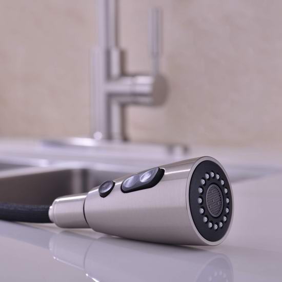 这款升级版多功能拉出式厨房水龙头,具有充气水流、强力清洁冲洗和暂停3种模式,采用优质无铅不锈钢制成,拉丝镀镍饰面,可抵抗日常使用造成的锈蚀。单手柄,轻松控制冷热水。