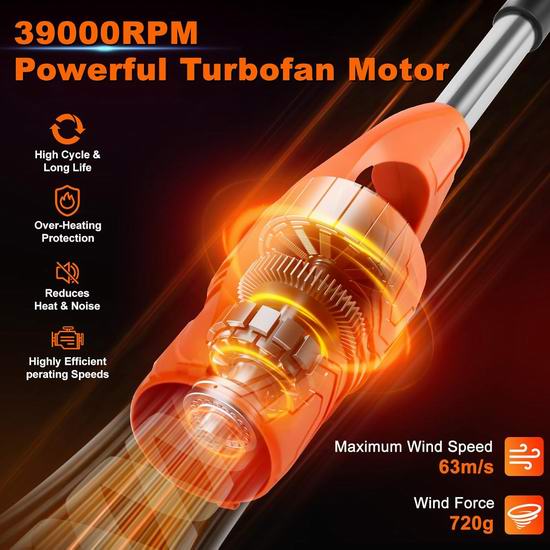 这款可折叠轻便电池式吹风机采用先进的涡轮增压技术,可产生高达141英里/小时风速、600CFM风量和39000转/分钟转速。这款高效清洁的升级版无线吹风机突破了传统吹风机的局限和笨重感,风速可调节,轻松处理落叶、灰尘、石块、积雪和其他杂物。配备符合人体工程学的手柄,始终让您的双手处于最舒适的操作位置。可折叠收纳,方便存放于汽车后备箱或棚屋等狭小空间。配备两块新一代3000mAh电池,具有短路保护、过热保护和过充保护功能。续航时间长达40分钟,充电2小时即可充满。