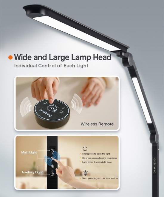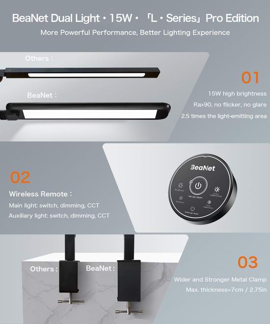 这款LED台灯拥有Ra>90的高显色指数(CRI),可提供接近自然日光的光线,确保色彩还原准确,灯光无频闪,不含蓝光,有效保护眼睛。提供四种色温和四种亮度级别,主灯和辅助灯均可独立调节。耐用的铝合金结构确保了出色的散热性能,夹式设计节省空间并确保稳定性。配备无线遥控器,可轻松调节主灯和辅助灯的亮度和色温。