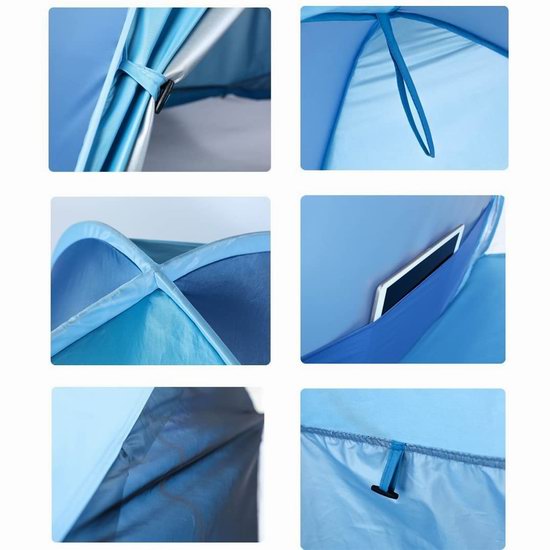 采用银色涂层面料,防水防紫外线,创新结构,可在数秒内自动弹出,网状后侧帘,阳光照射下保持通风和凉爽,整体重量仅2.2磅,外形尺寸160 x 150 x 110厘米,配送便携包,可随身携带,适合沙滩、公园、钓鱼等户外场合使用。