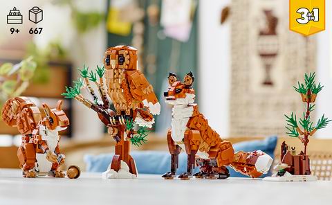 乐高创意百变组 3 合 1 森林动物红狐拼搭套装(31154)适合 9 岁及以上儿童,可使用同一套积木拼搭成红狐、猫头鹰或松鼠三种动物模型,带来丰富的创意玩法。模型多处关节可活动,例如狐狸的头、腿和尾巴,猫头鹰的头部可 360° 旋转,松鼠的头部和爪子也可动;同时配有树桩、树枝底座和橡子等场景配件,增强展示与故事玩法,是兼具拼搭乐趣与创意探索的节日或生日礼物。