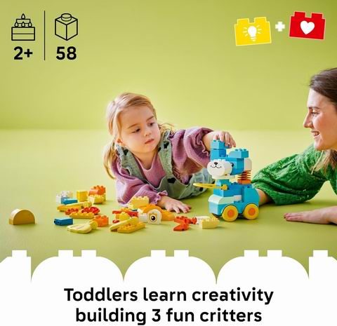 一款专为2岁及以上幼儿设计的益智积木套装。内含58块大颗粒积木,小手也能轻松抓握,孩子们可以在轮子底座上拼搭出带轮子的鸭子、鱼或小狗,甚至自由发挥创造专属动物。通过拍打鱼鳍、摆动翅膀等活动,有助于锻炼幼儿的运动技能和解决问题的能力,同时在学习平衡与物理原理中激发想象力。