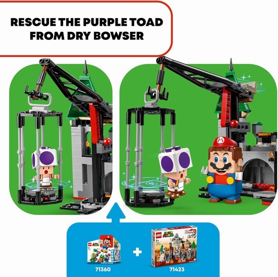 这款与枯骨酷霸的城堡对战,在超级马力欧世界中创造一个标志性地点的乐高积木版。套装拥有一个可以打开的酷霸嘴巴形状的入口,一辆可将紫色奇诺比奥从陷阱中救出并把枯骨酷霸击倒的起重机,可用来击败枯骨吞食花和枯骨栗宝宝的脚蹼,乌卡熔岩攻击功能,还包含健身房、秘密入口、秘密战略会议室、钥匙砖块和藏宝箱砖块。