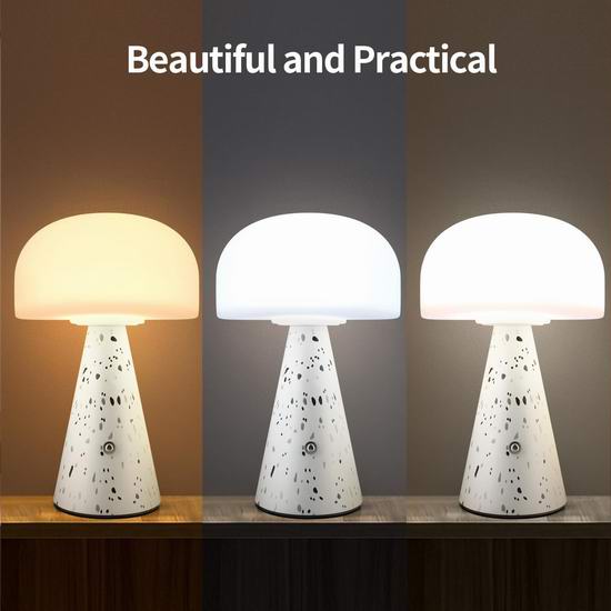 采用天然石材质感底座设计,可爱温馨的蘑菇造型有助于缓解压力。具备自然光、白光和暖光三种灯光模式,可通过触摸调节。长按开关即可在 2700K 至 6000K 之间无级调节亮度。充电4小时,在最亮模式下可持续照明6小时,在最暗模式下可持续照明20小时。
