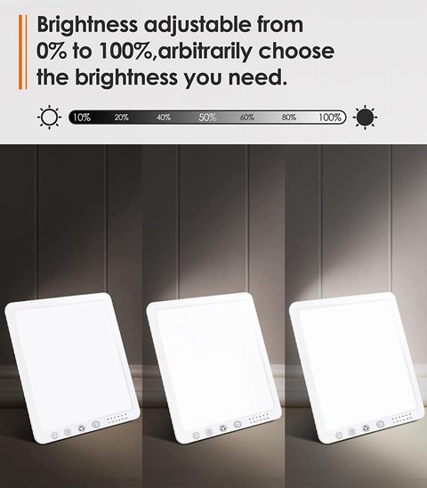 这款光疗能量灯专为治疗冬季忧郁而研制,采用光疗创新技术,12000 lux光疗法,可发出(2700-6500K,3挡)色温的自然光线,其效果类似于晴天的太阳光照射,但不含太阳光有害的紫外线,实现类似于12000勒克司白光产生的效果,且亮度均匀舒适,不会刺激眼睛,可在边读书或边工作时使用,每天只需30分钟即可帮助改善能量水平和心情,让人变得更有活力和积极性,对于战斗力下降、疲劳和冬季抑郁者非常有效。触摸控制,20%-100%亮度无级调节,自动记忆前一次设置,支持10/20/30/40/50/60分钟定时关闭。