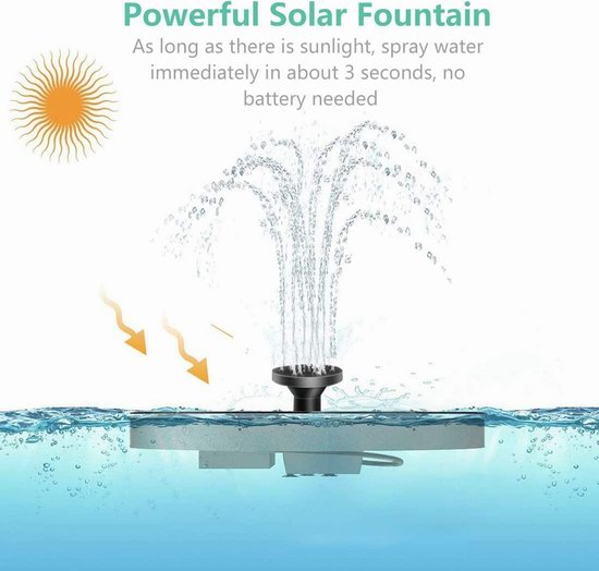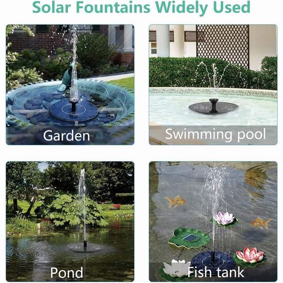 采用太阳能电池板供电,在阳光充足的条件下自动运行,无需接线,配备6个不同喷嘴,实现不同效果的喷泉,可浮在水面、水池、游泳池、水盆或大型水族箱。