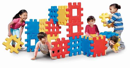 超大的华夫积木块色彩明快,可以紧密结合在一起,分量轻却安全稳固,搭出无穷无尽的创意——可以搭成一个围栏,让宝宝在里面玩球;可以搭出一个隧道,让宝宝练习爬行……每片尺寸14*14*2英寸。室内外皆可使用。