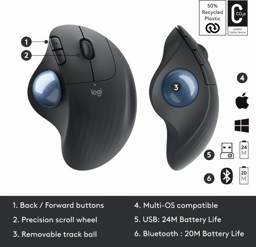 使用符合人体工程学造型的无线轨迹球,可大幅减少运动并提供非凡的舒适度。无需四处移动手臂即可移动光标,让手和手臂保持放松状态。顺滑灵敏的拇指控制方便易用,表面的透明涂层,拇指可轻松操控顺滑的轨迹球。拥有高性能光学传感器,Logitech光学追踪技术,出众的光标跟踪和低功耗。ERGO M575有两种连接方式,通过蓝牙低功耗技术或随附的USB接收器均可连接,10米内都可稳定连接。电池续航约24个月,额定400 dpi,最大DPI2000。