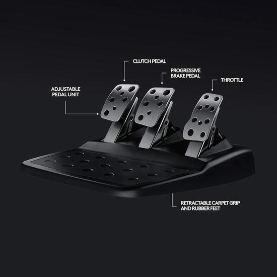 配备金属踏板,表面带有防滑橡胶颗粒,油门踏板带有专门的便于做跟趾动作的设计。强大的双马达力反馈技术,可以逼真地模拟力反馈效果,在每一转弯处和各种类型的地势上感受轮胎的摩擦,察觉漂移时的转向不足或过度转向等等。G29 的方向盘所有控制键的位置均触手可及,利用带有集成油门、刹车和离合器踏板的单独底板踏板装置,保持更贴近现实的驾驶姿势,加速、刹车和换挡,一切如同真实汽车一样。