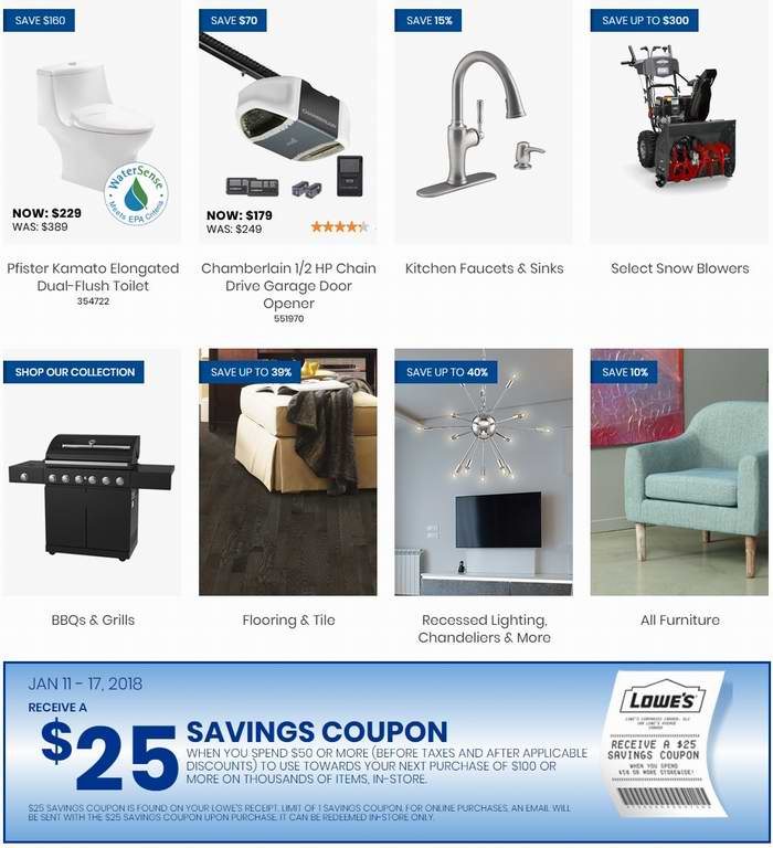 Lowe's网店销售,1月17日前,精选大量商品特价销售,满125加元使用折扣码:SAVE5 额外再打9.5折;满250加元使用折扣码:SAVE10 额外再打9折;满500加元使用折扣码:SAVE15 额外再打8.5折;满50加元,送满100加元立省25加元优惠券,小件商品购满49加元包邮,选择店内取货免邮,点击进入订购页面