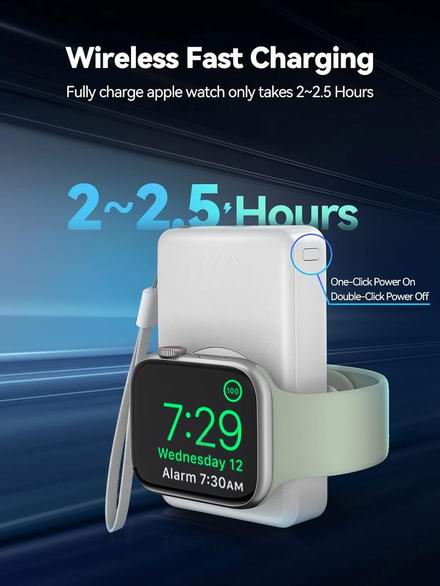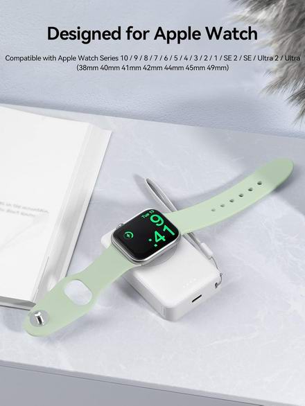 这款充电宝具有4000mAh容量,可为Apple Watch充满电4~6次,为iPhone手机补充40%电力。内置4个LED指示灯,方便查看剩余电量。内置强磁吸附模块,确保手表吸附在充电器中心,兼容 Apple Watch Series 10 9 8 7 6 5 4 3 2 1 SE Ultra 智能手表。具有USB-C充电口,可为手机等设备应急充电。