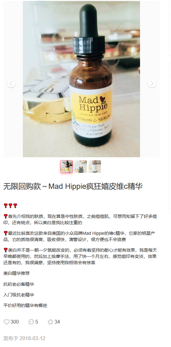 这Mad Hippie美白抗氧化精华:算是高端小众品牌,但口碑很好。成分有VC(非左旋C),另外VE、阿魏酸,葡萄籽,洋甘菊,透明质酸,算是平价版的CEF。每一个成分都是美白抗氧化的,尤其阿魏酸(主要存在于植物细胞壁中),可以让维生素C的抗紫外线效果加倍。此外也有提亮肤色和紧致的效果。半透明的蛋清质地,很清爽,尤其适合干性偏油皮肌肤,晚上先用乳液打底,再上这款精华,第二天肌肤非常白净,且一直到晚上都是白嫩的。