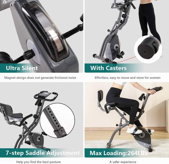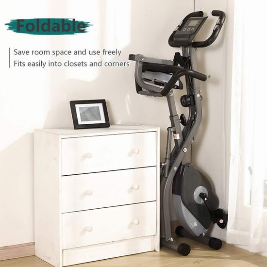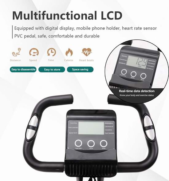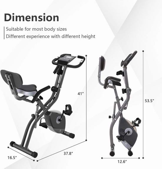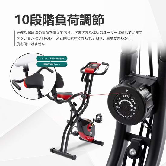 采用X形框架设计,可轻松完全折叠起来,便于收纳,可调节10级阻尼,静音平稳运行,配备LCD液晶显示屏,可显示速度、距离、时间、脉搏和消耗热量等数据。软垫坐凳,高度可根据需要进行调节,满足不同身高人士需求,最大承重330磅,外形尺寸为12.6“长x 16.5”宽x 53.5“高。