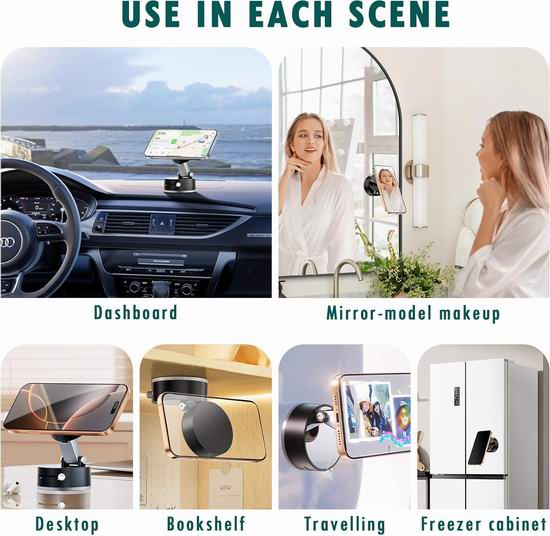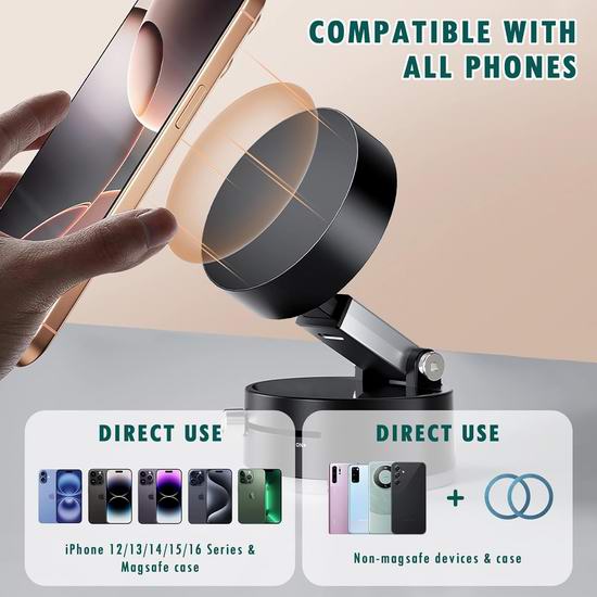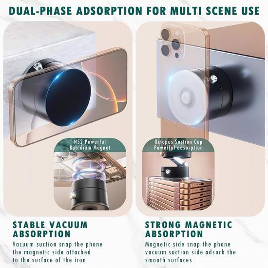 这款吸盘式手机支架采用双排环形 N52 强力钕磁铁,配备 20 个强力磁铁,可牢固地固定您的手机,确保其在使用过程中不会掉落。采用全新的杠杆式真空吸附技术,内置机械按钮,只需轻轻拨动按钮即可吸附或释放。手机支架采用全新升级的加厚TPE高弹性真空吸盘底座,易于放置且吸附力强。防尘防污,即使表面脏污也能牢固吸附,使用后不留痕迹。可以牢固地吸附在各种光滑的表面上,例如塑料、亚克力、玻璃、金属、瓷器、光滑的瓷砖、大理石和光滑的平面不锈钢表面。对于非磁性手机和手机壳,请将随附的磁环贴在手机背面。