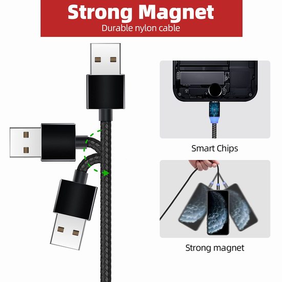 可360°旋转磁吸设计,超强磁性,充电更方便,精准完成磁吸连接,提高充电效率。每条线配备USB C和Micro USB 2种不同类型的磁性接口,内置LED灯,便于在黑暗环境中轻松找到数据线。