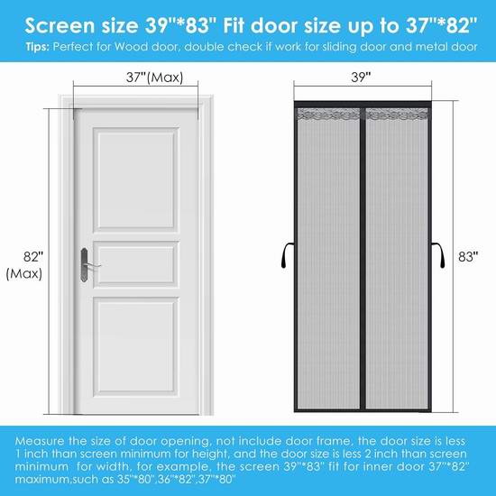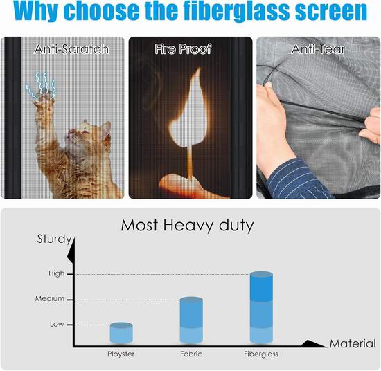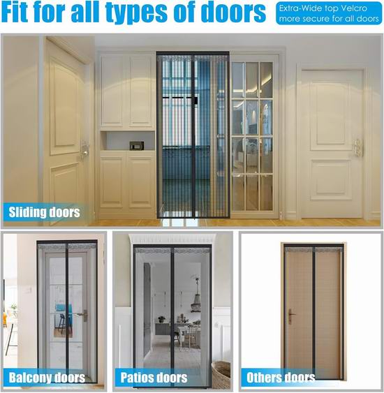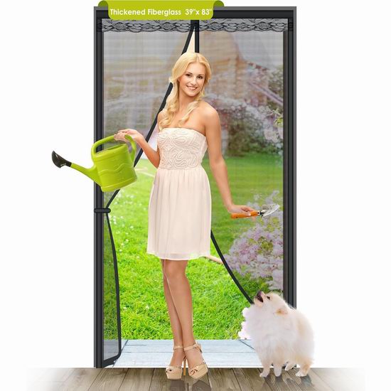 这款纱门比涤纶纱门更结实,防刮防撕裂,经久耐用,防火阻燃,对有小孩和宠物的家庭尤其有利。安装简便,配备加宽4英寸的魔术贴,防脱落,附赠额外的图钉。只需将自粘钩带贴在门框上,再将钩带贴在纱门上即可完成安装。纱门可拆卸折叠,可水洗。纱门网面配有系带,方便聚会时进出。内置36块强力磁铁自动闭合,密闭无缝,防止蚊虫进入。纱门尺寸为39 * 83英寸,适用于最大尺寸为 37 * 82英寸的门。