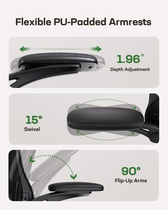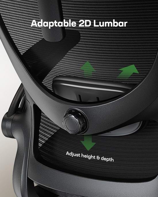 这款全可调办公椅,配备可调节的 2D 头枕、90° 至 120° 倾斜的靠背和 3D 可调节扶手,可随意调整多种工作姿势,同时缓解长时间坐着引起的背部疼痛。腰部支撑系统可前后调节 1.18 英寸,上下调节 2.16 英寸,完美贴合人体腰背部的脊柱,保护脊柱健康。简约的网布靠背贴合背部曲线,提供灵敏支撑,同时促进空气流通,让您保持凉爽。座垫采用 3.14 英寸厚的高密度泡沫,让您的日常工作舒适度倍增,承重高达 300 磅,经久耐用。加宽的座椅提供更大的承重面积,有效缓解臀部压力。圆润的PU软垫扶手可前后移动,并可左右旋转,找到最舒适的手臂位置。