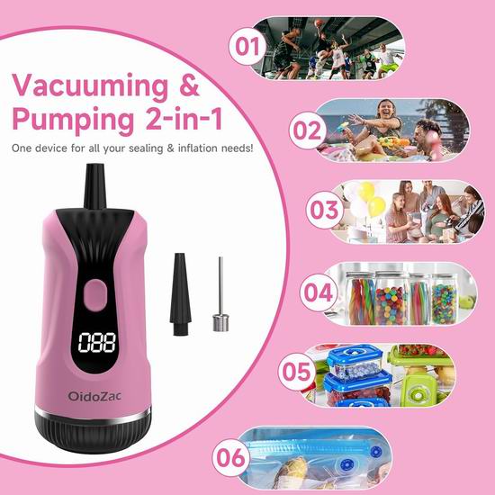这款真空封口机具有65kpa强大吸力,仅需10秒即可实现紧密真空密封,帮助延长食物的保鲜时间。其专业可拆卸储水设计能够存储从袋中抽出的水。不仅支持普通和宽口梅森罐的真空密封,还可作为电动气泵,轻松为各种球类、气球和游泳圈等充气,一机多用。同时,全新专利易盖杯盖采用创新结构设计,有效解决传统杯盖开启困难、易变形和伤手的问题。套装包含:真空封口机,3个普通口和 3个宽口密封盖,3个充气针,1条充电线。