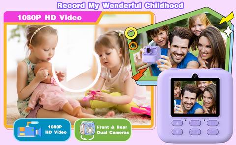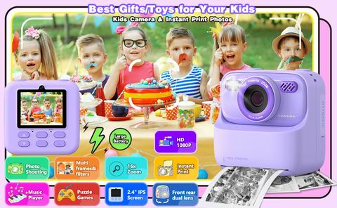 Masterbee 儿童即时打印相机支持热敏打印(无需墨水、不含 BPA),提供灰度和点阵等多种打印模式,并附带3卷相纸,让孩子随拍随打、还能涂色创作。相机具备前后双摄、1080P 视频录制、滤镜相框、游戏和音乐等多功能,搭配2.4英寸屏幕和多种拍摄模式,玩法丰富。内置电池续航约6-8小时,配32GB存储卡可保存大量照片,是适合3-12岁儿童的创意启蒙与娱乐兼具的礼物。