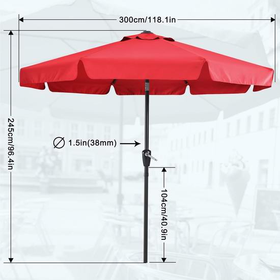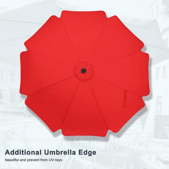 这款户外庭院遮阳伞采用独特设计,饰以优雅的褶边。摇柄设计,开合便捷。按压式按钮可根据阳光角度调节倾斜角度,提供大范围遮荫。采用防锈粉末涂层铁铝合金框架,配有6根铝合金加强筋,经久耐用。顶部设有单通风口,增强稳定性。直径3米,可为方形、长方形或圆形餐桌及 4-6 把椅子提供充足的遮荫。伞面采用 100% 涤纶制成,具有防水、防紫外线、持久耐用、不易褪色和易于清洁等特点。不含底座。