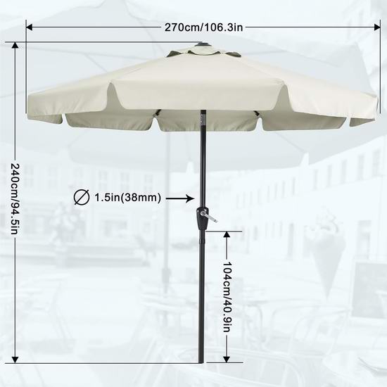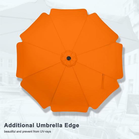 这款户外庭院遮阳伞采用独特设计,饰以优雅的褶边。摇柄设计,开合便捷。按压式按钮可根据阳光角度调节倾斜角度,提供大范围遮荫。采用防锈粉末涂层铁铝合金框架,配有8根铝合金加强筋,经久耐用。顶部设有单通风口,增强稳定性。直径2.7米,可为方形、长方形或圆形餐桌及 4-6 把椅子提供充足的遮荫。伞面采用 100% 涤纶制成,具有防水、防紫外线、持久耐用、不易褪色和易于清洁等特点。不含底座。