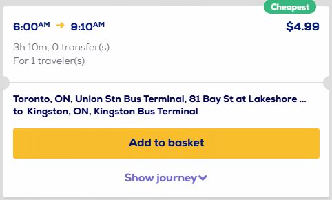 多伦多开往金士顿(Kingston)票价仅4.99加元: