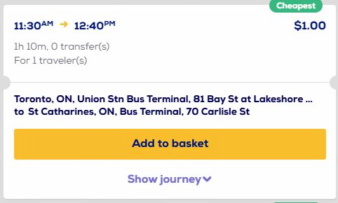 多伦多开往圣凯瑟琳斯(St Catharines)票价仅1加元: