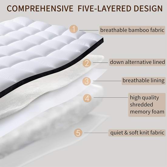 采用优质碎记忆海绵填充,更柔软、舒适、透气,让您感觉如同睡在云端。适用于8-21英寸深的床垫,四周采用弹性织物,可将床垫固定到位。可冷水机洗,低温烘干,不缩水、不褪色。