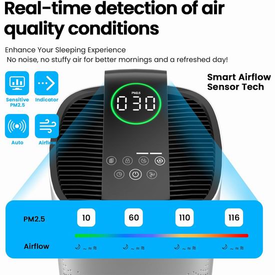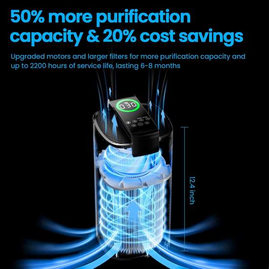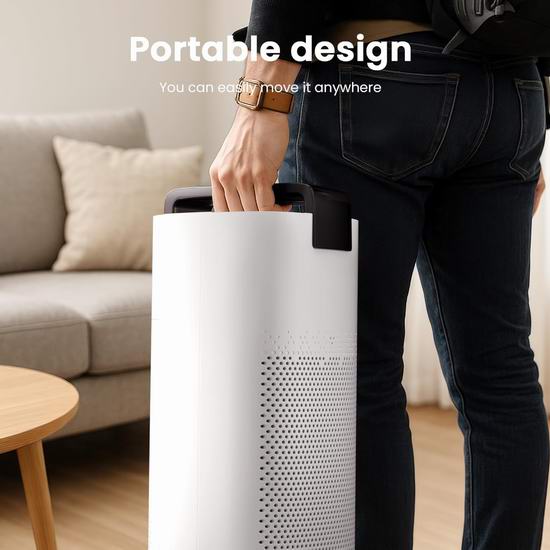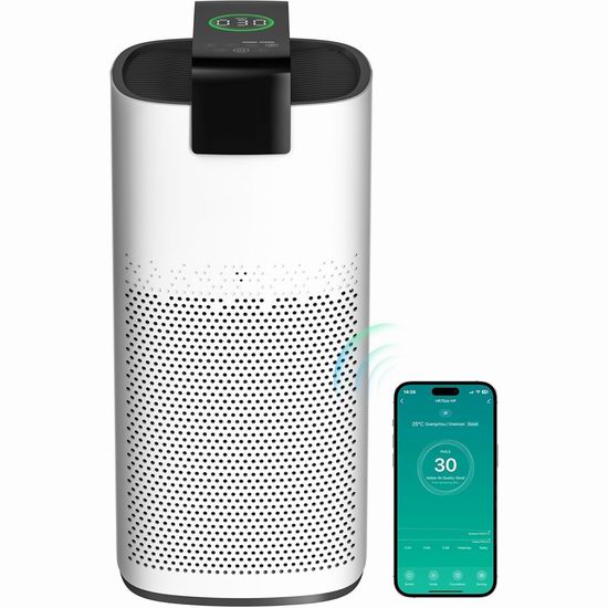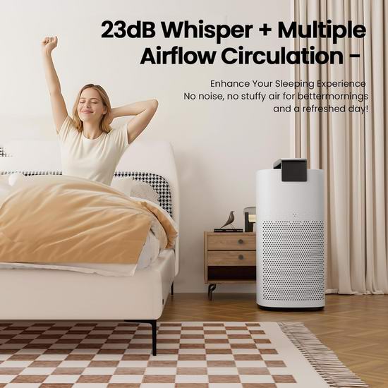 这款高性能空气净化器专为大空间设计,拥有四层过滤系统,能有效去除PM2.5、灰尘和异味,适用于面积达3600平方英尺的空间。采用4层HEPA高效空气净化滤网,结合活性炭,是家庭宠物、异味和污染物的理想空气净化器。搭载激光传感器实时追踪PM2.5浓度,4色氛围灯+LED屏幕显示空气质量。支持WiFi,可通过应用程序/语音远程控制,检测环境空气状况,自动模式会根据空气质量调节风速,确保空气净化器高效运行。支持1-24小时定时和5档风速调节,睡眠模式下关灯,运行噪音仅23分贝。
