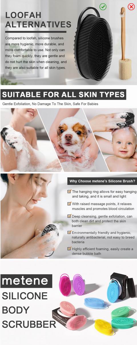 采用柔软安全的食品级硅胶材质制成,泡沫丰富、速干易清洁,耐用且适合所有肤质,尤其适合敏感肌。双面设计:一面为柔软长毛刷,可温和清洁身体各部位;另一面为按摩摩擦面,可放松肌肤、舒缓关节。4.7×2.8×1.34 英寸的尺寸握感舒适,带有悬挂环便于晾干更卫生。可深层去除污垢与死皮,促进血液循环和新陈代谢,让肌肤洁净光滑、焕发活力。