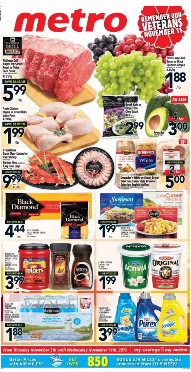 Metro本周(2015.11.5-2015.11.11)打折海报,冰冻帝王蟹腿立减7元,每磅9.99元