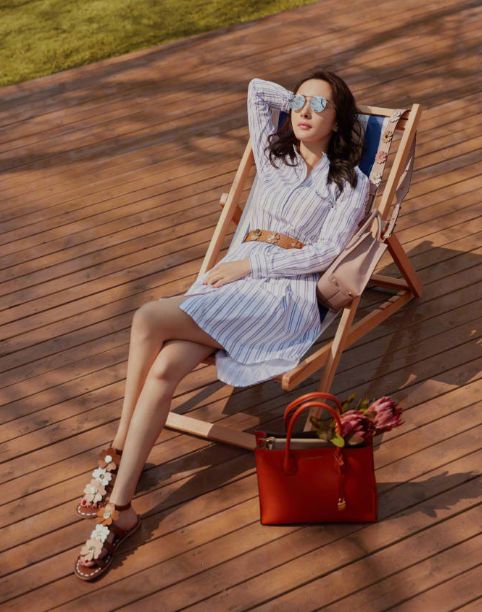 和煦的阳光,散发春日独特的气息。在暖意袭人的明媚午后,慵懒地靠在沙滩椅上,尽情享受写意的好时光。和杨幂一样身着简约的条纹连身裙,配搭花饰凉鞋与精美手袋,演绎优雅甜美。