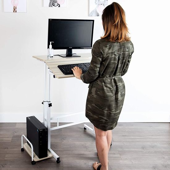采用坚固的钢结构框架,高度可在30-45.5英寸之间调节,站坐交替使用,缓解颈椎腰椎压力,双层设计,高度可调节,甚至可以放平,上层可用于放置显示器、书籍和其他物品,内置可锁定万向轮,方便移动。