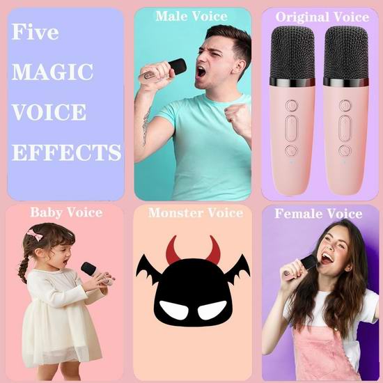 这款便携式卡拉OK机配备2个无线麦克风,采用高性能音频驱动和先进的数字信号处理器,可与手机、平板、电脑等设备快速稳定地通过蓝牙连接,并播放来自Spotify、YouTube等任何音乐应用程序的所有您喜爱的歌曲,还支持TF卡作为音乐源,带来完美的歌唱体验。具有神奇的变声功能,例如女神声、叔叔声、怪兽声、婴儿声,趣味十足,深受孩子们喜爱;背面设有耳机输出接口,适合唱歌练习和家庭卡拉OK。充满电后,在最大音量下提供长达6小时的播放时间。
