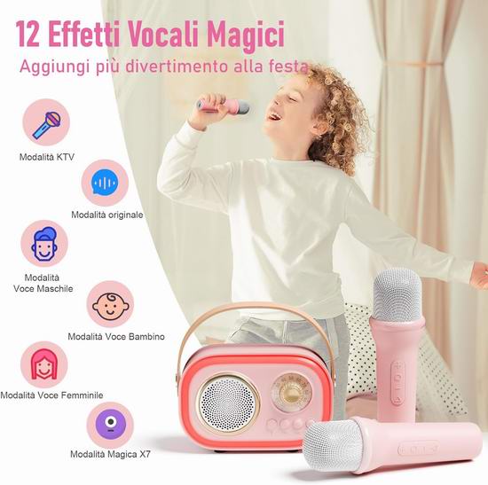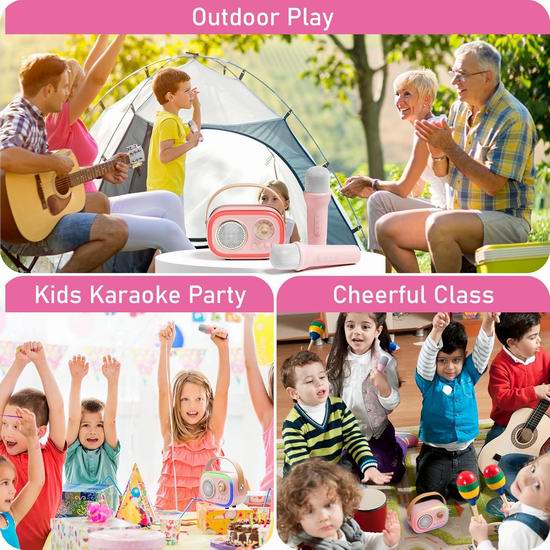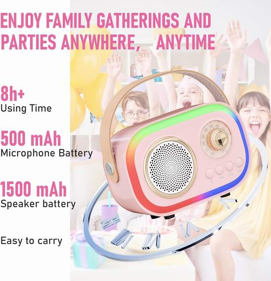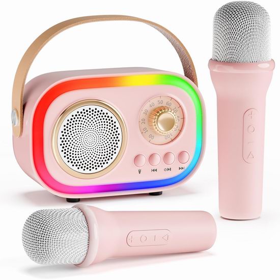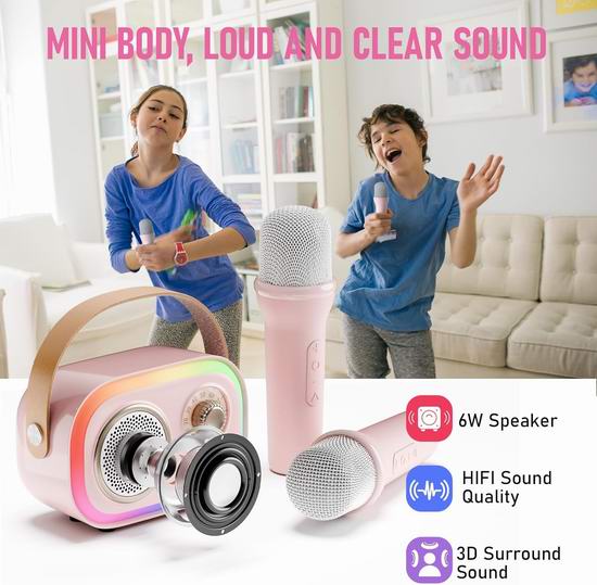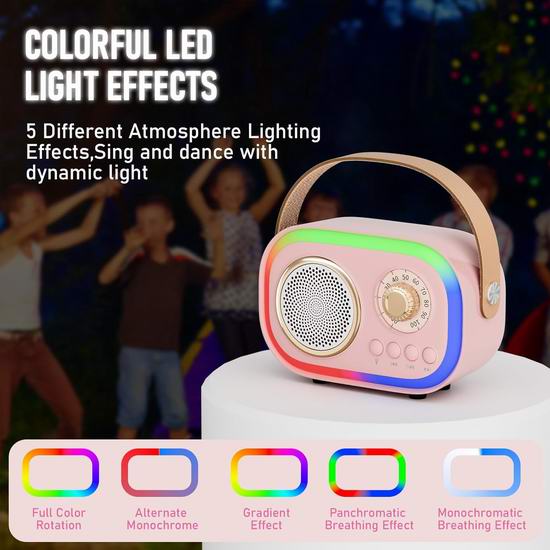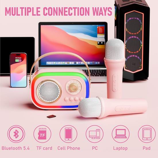 这款迷你卡拉 OK 机配备高性能音频驱动器和先进的数字信号处理器,使声音更清晰,音量更适中,实现声音平衡,并最大限度地减少失真。采用最新蓝牙连接技术,连接范围可达15米,实现无线流媒体播放,确保即时配对,传输更稳定。还支持Micro TF卡播放音乐文件。采用经典复古外观设计,旋钮式音量调节,搭配炫彩夺目的LED迪斯科灯光效果,完美融合现代功能。配备两个无线充电麦克风,可变换12种魔幻音效,趣味十足,可爱至极。灯光随着音乐节奏舞动,专业级音效为派对提供无尽的娱乐可能。内置可充电电池,续航长达8-10小时。