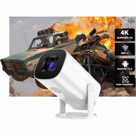 这款投影仪具有原生1280 x 720分辨率,亮度高达200 ANSI 8000流明,对比度10000:1,支持播放4K视频,内置双频WiFi,搭载Android 11操作系统,可以下载安装Youtube、Netflix、Disney+、Prime video等程序,无需手机或其他设备也能通过WiFi观看视频。通过调整与墙面距离,可实现40-200英寸屏幕的投影,支持自动水平校正。内置2个5W立体声扬声器,支持蓝牙,可连接蓝牙耳机或蓝牙音箱播放声音。