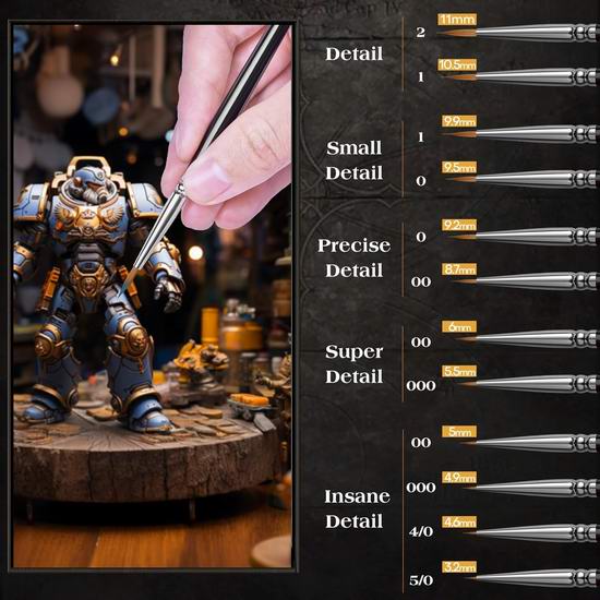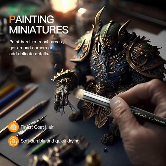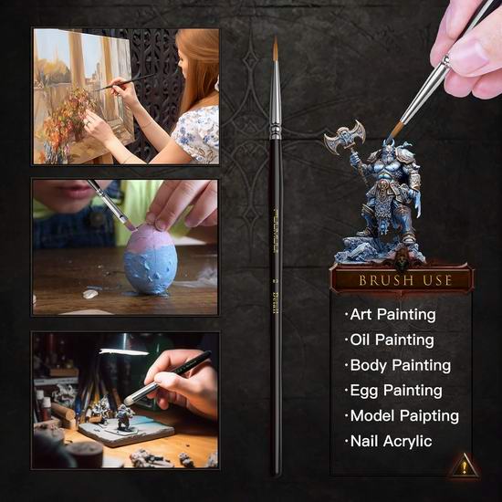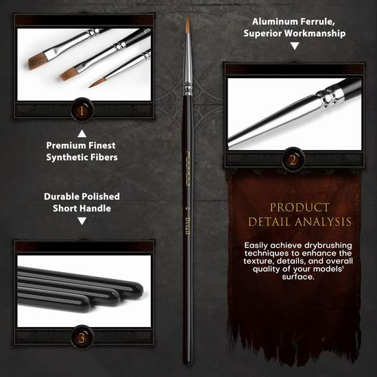 采用山羊毛,刷毛浓密、半硬且富有弹性,专为模型涂装而设计,可帮助艺术家和模型制作者轻松掌握干刷技巧,增强模型表面的纹理、图案和细节效果,也可用于其他涂画,例如干刷边缘、干刷高光、干刷纹理等。画笔拥有超细且不易开裂的笔尖,能够轻松绘制出纤细的线条、底色、中间色调、层次、高光和细节。适用于油画、水彩、丙烯、珐琅漆、赛璐珞漆和水粉颜料。可用于绘制微型人物、野生动物、肖像、玩偶、插画、模型船和飞机、工艺品、岩石、陶瓷等。