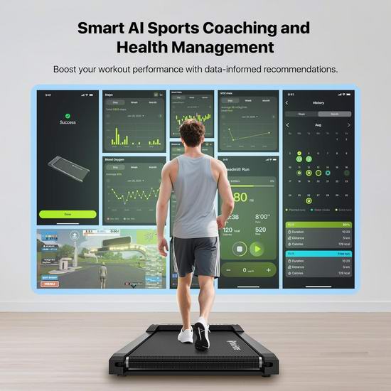这款走步机强劲静音电机,峰值功率高达1.65马力,运行噪音低于60分贝。配备了五层防滑减震跑带。高强度支撑层和减震层相结合,可在运动时有效保护您的膝关节和踝关节。AI助力跑步机训练,通过TicSports App获取个性化的每日训练计划、实时指标和即时 AI 教练反馈,帮助您更智能地训练并保持动力。虚拟训练功能,提升您的室内步行和跑步体验。连接虚拟步道,畅玩实时步行和慢跑游戏,为您的室内训练增添更多乐趣。在线竞技,体验沉浸式冒险,让您的健身之旅更加精彩。搭载LED显示屏,可实时监测卡路里消耗、速度、时间和距离等关键指标,让您能够定制和优化您的家庭健身计划。使用随附的遥控器,可以轻松控制走步机启动、停止以及调节速度。内置高品质扬声器,让您在运动时也能享受音乐。净重仅13公斤,一人即可轻松完成收纳和搬运。