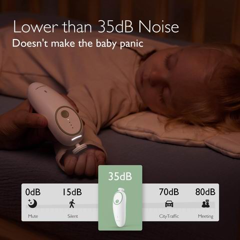 Momcozy 电动婴儿指甲锉内置可充电电池,Type-C 充电(附收纳盒与线缆,建议用电脑或 5V/1A 适配器,充电时勿使用);配 7 个替换磨头(4 个婴儿用+3 个成人用)和 4 档速度,适合新生儿到 0–36 个月及全家;支持最低约 3500 转/分钟的温和修剪,并带触控停止保护,减少误伤风险;360°雾面 LED 夜灯无眩光,夜间也能看清;1 档噪音低于 35dB,宝宝睡觉时也更不易被惊醒。