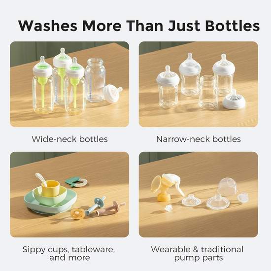 这款一体式清洁机,可以自动清洗、消毒和干燥婴儿奶瓶、吸奶器、婴儿餐具等。内置4组12个定向喷嘴,刷洗每个瓶子的内部,而10个旋转喷嘴清洁表面,不会遗漏任何污渍。双层设计可同时容纳最多4个奶瓶和其他婴儿用品。预设四种模式自由组合,并自定义设置。选择快速清洗模式,只需19分钟即可高效清洗奶瓶。清洗后,奶瓶可在清洁机中保持干燥清洁长达72小时。气流由医用级 H13 HEPA 过滤器净化,可去除 99.9% 的空气悬浮颗粒。