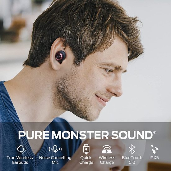 采用Pure Monster Sound™调音技术,纯正魔声重低音。SecureFit Sportclip™耳翼稳定系统,高强度运动不松脱。左、右耳皆可独立使用,蓝牙5.0连线品质快速稳定。IPX5防水系数,汗流浃背也不怕。耳机续航6小时,搭配充电舱总续航24小时,支持快充5分钟,续航1小时。