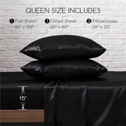 采用600支纱缎面面料,触感丝滑柔顺,可减少头发毛躁与断发、降低睡眠时对肌肤的摩擦,长期使用有助于减少睡眠痕迹;相比真丝更耐用、不易起球抽丝,兼具良好透气性与温控性能,机洗时建议冷水轻柔模式、低温烘干,以奢华质感与亲民价格提升日常睡眠体验。套装包含一张90×102英寸床单、一张60×80英寸带15英寸深床笠的床笠(加固弹性角带防滑脱)及两个20×30英寸枕套。