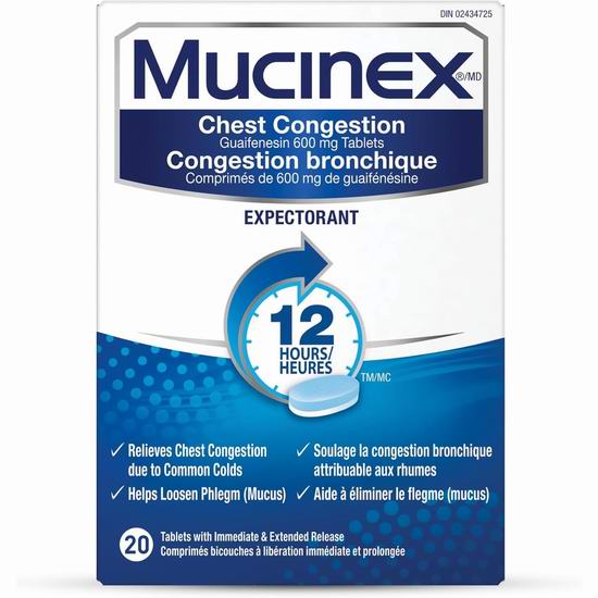 Mucinex 缓释双层片是一款有效的非处方祛痰药,专为缓解感冒引起的胸闷和呼吸不适而设计。其独特的双层缓释配方即刻释放有效成分,并持续作用长达 12 小时,提供全天候的舒适感。这款祛痰药能够帮助稀释痰液,使咳嗽更加有力,迅速清除呼吸道的黏液堆积,让您感到畅快和轻松。其作用温和且持久,适合需要长期缓解感冒症状的人群。