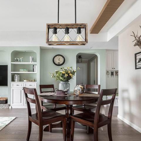 采用金属木纹饰面,兼具质朴美感与耐用性。灯杆(14英寸)与链条(25英寸)支持高度调节,适配不同空间需求;宽16.5英寸的金属框架能有效聚光投射。灯具通过硬线连接,支持平/斜装,适配E26灯泡(需自备),适用于厨房岛台、餐桌、走廊等场景,轻松营造工业风与农舍风格融合的家居氛围。