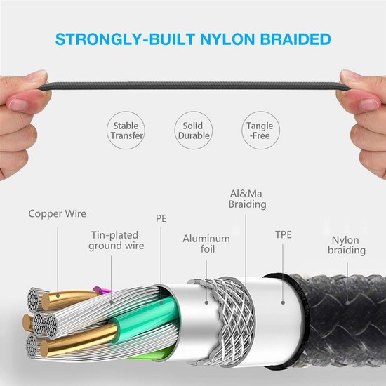 此款数据线采用三合一设计,具有Micro USB、USB-C和Lightning三个接口,可同时为3台手机平板等设备充电,尼龙防护,超级耐用,长度为1.2米。
