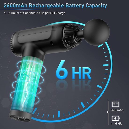 此款筋膜枪配备大扭矩无刷电机,其高频振荡作用可直透12mm深层骨骼肌,令骨骼肌瞬间放松,经络神经血脉瞬息畅通。配备6个专业按摩头,30速可调,通过枪头冲击身体目标部位来帮助肌肉软组织放松恢复,减少局部组织张力、缓解颈部、腰背、肩膀、腿部疼痛、促进血液循环。同时有效消散人体在因运动、工作、生活之中的疲劳而产生的大量肌酸,具有非常好的缓解肌体疲劳的作用。符合人体工程学设计,防滑握把,易于使用和抓握,可自我按摩。内置锂电池,续航可达4-6小时。