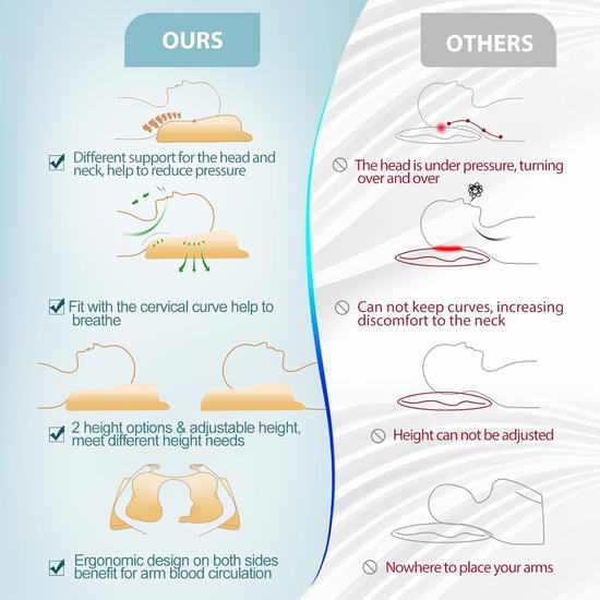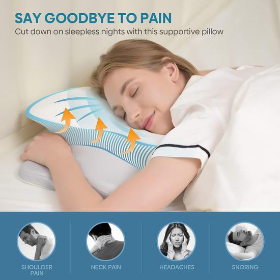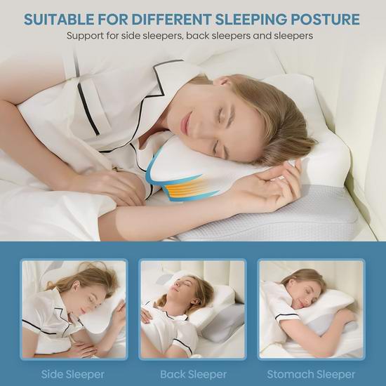 采用100%优质记忆海绵枕芯,符合CertiPUR-US认证标准,100%安全无毒,符合人体工学设计,独有蝴蝶造型,两侧不同高度(3.8-4.3英寸),满足不同需求,可以根据睡姿减轻压力,牢固地支撑头颈部和肩部,缓解肩颈部疼痛,保持舒适的睡眠姿势,适合各种睡姿。
