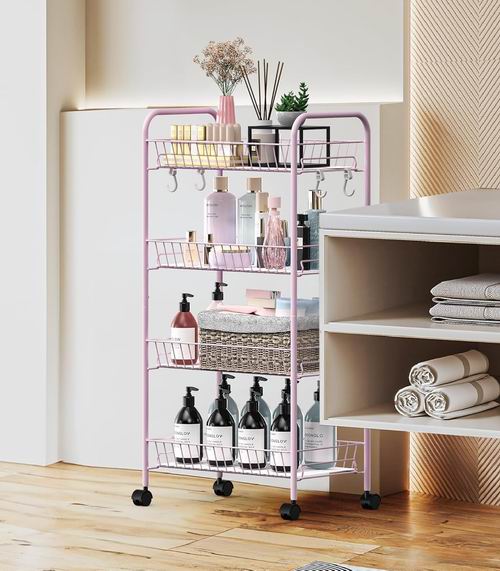 采用 360°万向滚轮+可拆卸金属篮设计,四层防摔储物空间适配厨房/浴室等多场景。坚固金属框架承重性强,纤薄机身节省空间,是灵活收纳家居杂物的移动解决方案。